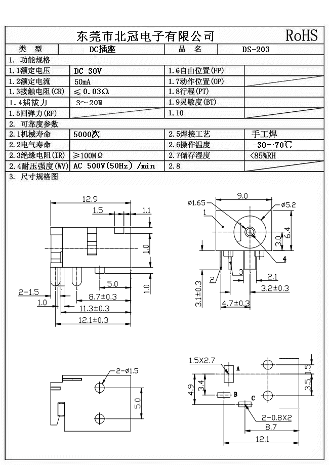 Typical Specifications 1. Rating : DC 30V 0.5A 2. Contact Resistance : 70ΩMax 3.Lnsulation Resistance: DC500V 1Minute 4.Operating Temperature Range: -25℃+80℃ 5.Ambient Humidity Used: ≤85%RH 6. Operating Force : 3-20N 7. Operating Life : 5,000Cycles