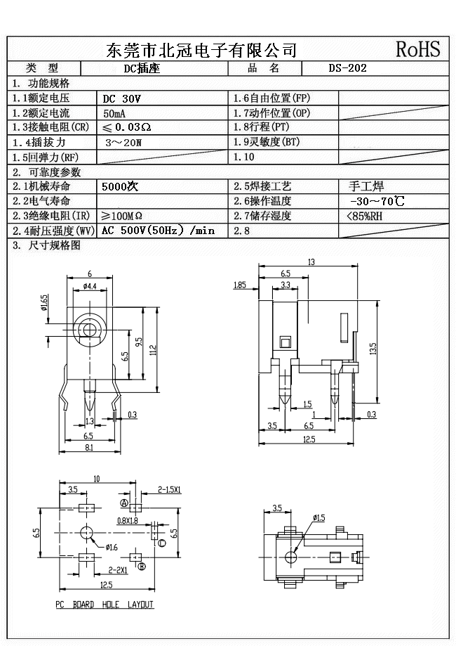 Typical Specifications 1. Rating : DC 30V 0.5A 2. Contact Resistance : 70ΩMax 3.Lnsulation Resistance: DC500V 1Minute 4.Operating Temperature Range: -25℃+80℃ 5.Ambient Humidity Used: ≤85%RH 6. Operating Force : 3-20N 7. Operating Life : 5,000Cycles