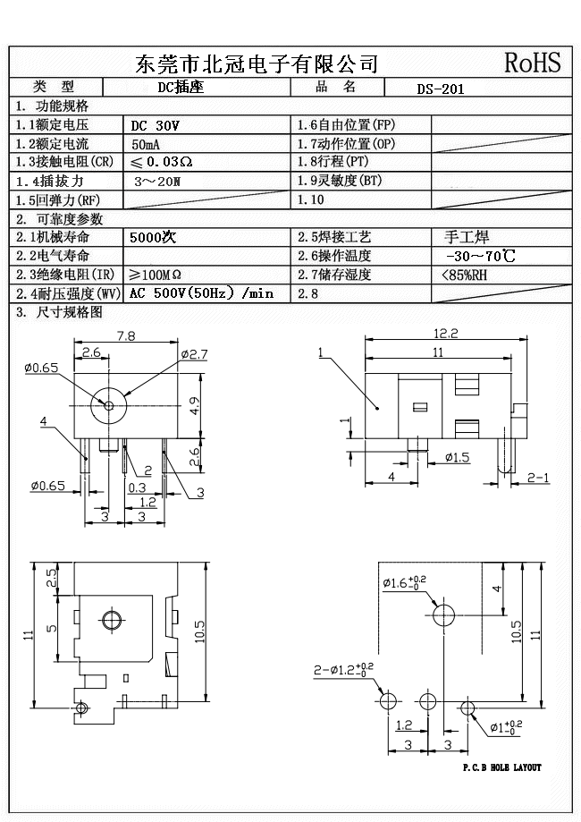 Typical Specifications 1. Rating : DC 30V 0.5A 2. Contact Resistance : 70ΩMax 3.Lnsulation Resistance: DC500V 1Minute 4.Operating Temperature Range: -25℃+80℃ 5.Ambient Humidity Used: ≤85%RH 6. Operating Force : 3-20N 7. Operating Life : 5,000Cycles