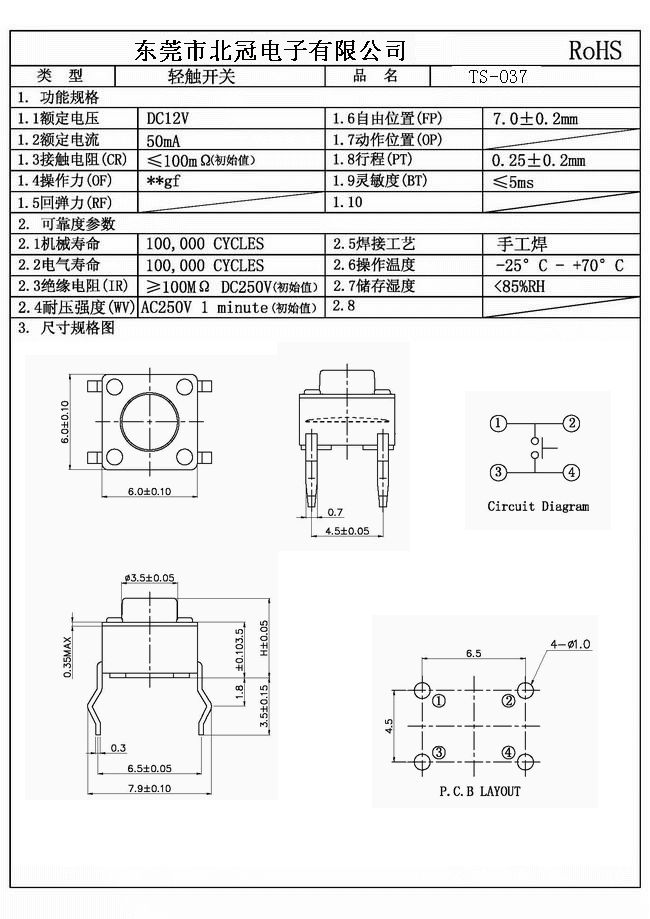 產(chǎn)品名稱(chēng):TS-037輕觸開(kāi)關(guān) Typical Specifications |