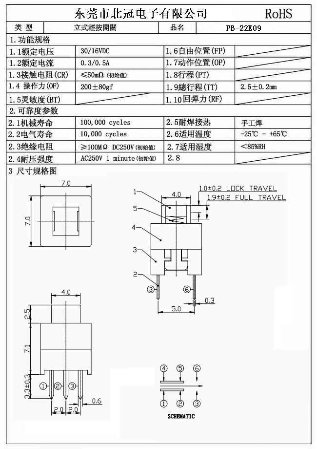 1.Rating : DC 30V 0.1A 2.Contact Resistance: ≤100mΩ 3.Lnsulation Resistance: ≥100mΩ DC500V 4.Operating Temperature Range: -25℃+80℃ 5.Ambient Humidity Used: ≤85%RH 6.Operating Force : 180 ± 50 gf 7.Mechanical Life : 10,000 Cycles 8.Solder Ability:260℃±5℃ 3s