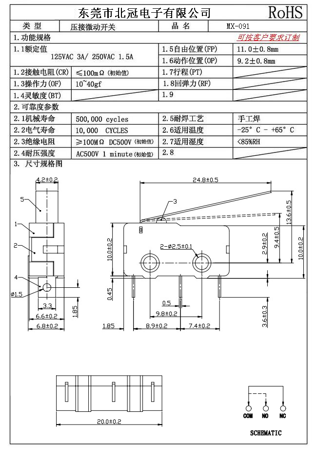 3.Lnsulation Resistance: ≥100mΩ DC500V