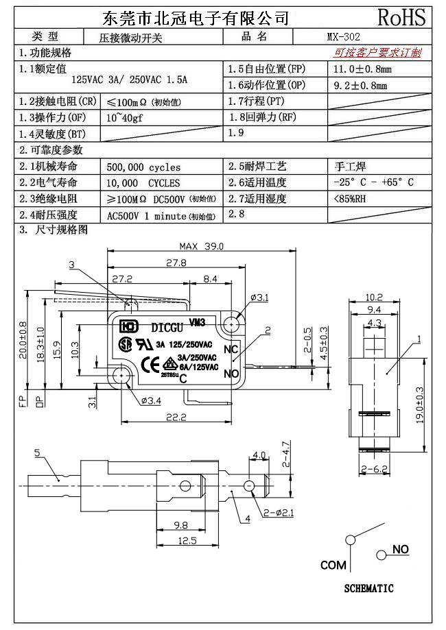 3.Lnsulation Resistance: ≥100mΩ DC500V